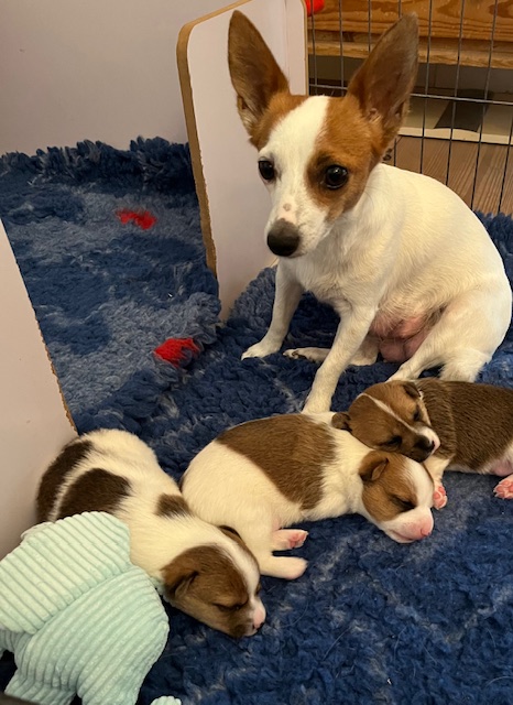 My fødte den 30. december 2024 3 hvalpe ved kejsersnit – to hanner og en tæve. Den ene han er hvid med fawn og den anden han er hvid med